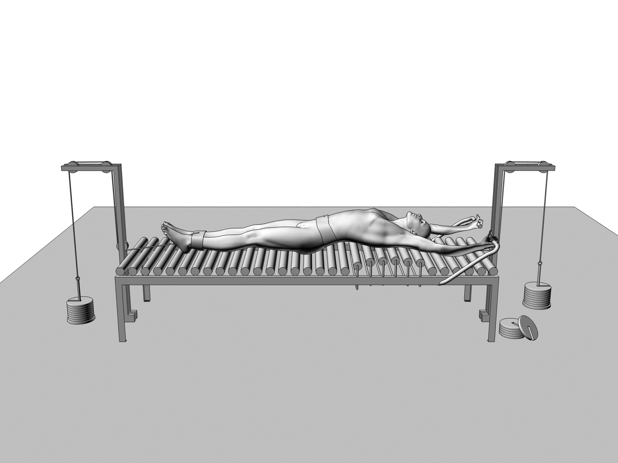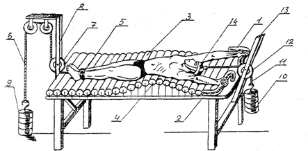 Горизонтальна тракція хребта здійснюється на тренажері Панаріна для тракції і корекції хребта в динамічному режимі патенту України №95723 А6Н1/02, А61F5/042. Тренажер містить: опори для рук - 1, розміщені на рамі - 2, валики - 3, закріплені на осі - 4, які мають можливість змінювати висоту розташування відносно рами - 2, на якій змонтовані, ремінь - 5, закріплений на пацієнті, зв'язаний за допомогою троса - 6, блоків - 7, закріплених на стійці - 8, з вантажем - 9, вантаж - 10, який за допомогою троса - 11, блока - 12, розміщеного на стійці - 13, зв'язаний з петлею Гліссона - 14, що закріплена на голові пацієнта.