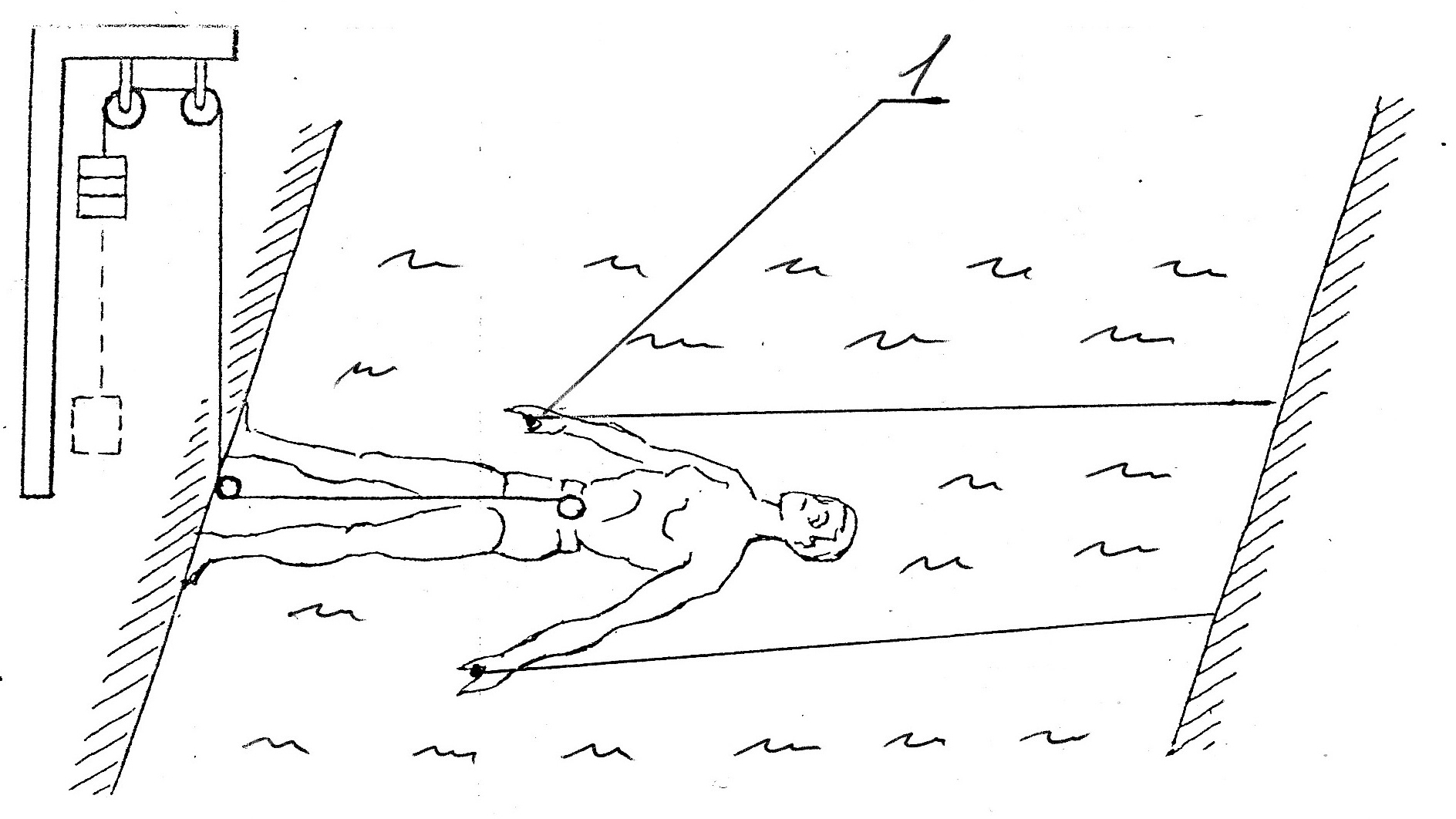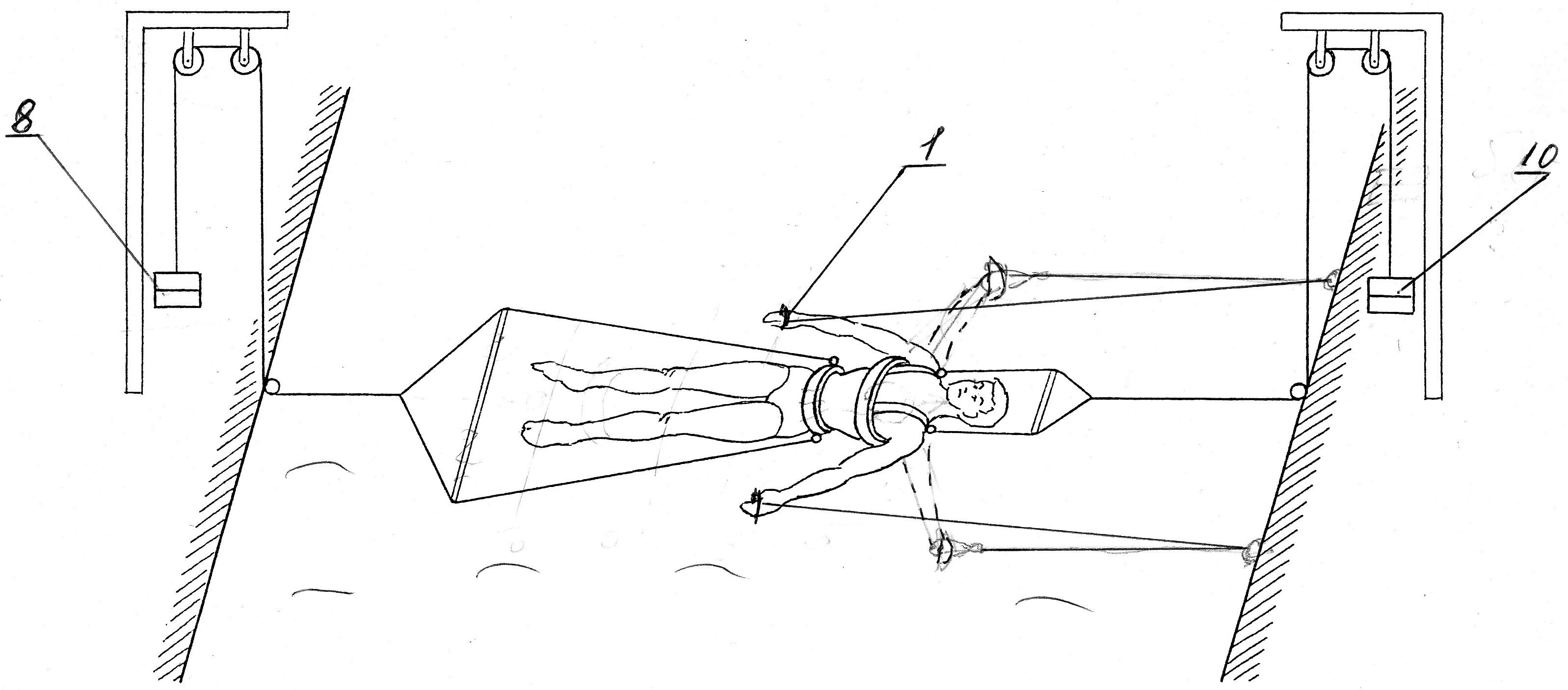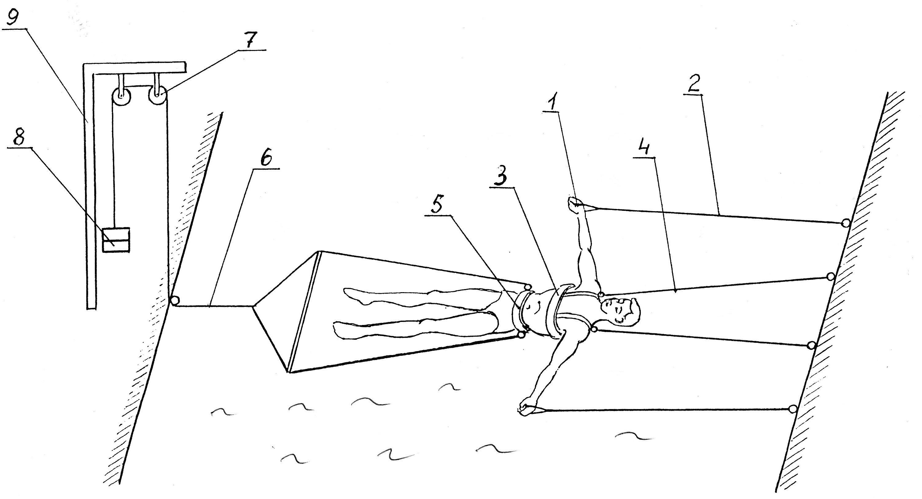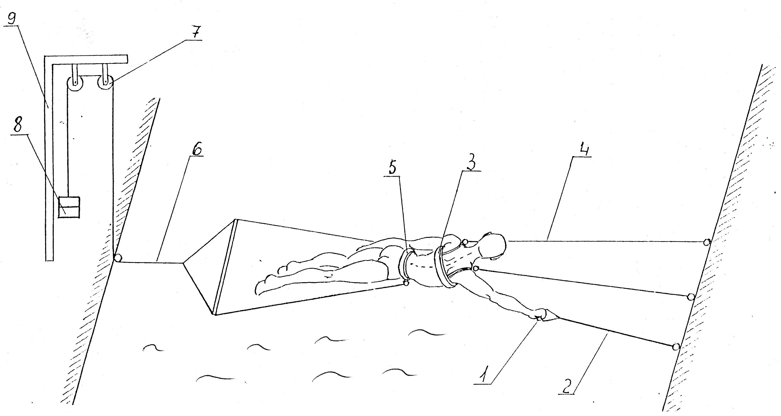 Конструкція містить: опори для рук – 1, які зв’язані нееластичними шнурами – 2, з бортиком мікробасейну; нагрудний ліф – 3, зв’язаний лямками – 4 зі стінкою мікробасейну, тазовий пояс – 5, який за допомогою троса – 6, блоків – 7 зв’язаний з вантажем – 8, що закріплений на стійці – 9 на протилежному боці мікробасейну.