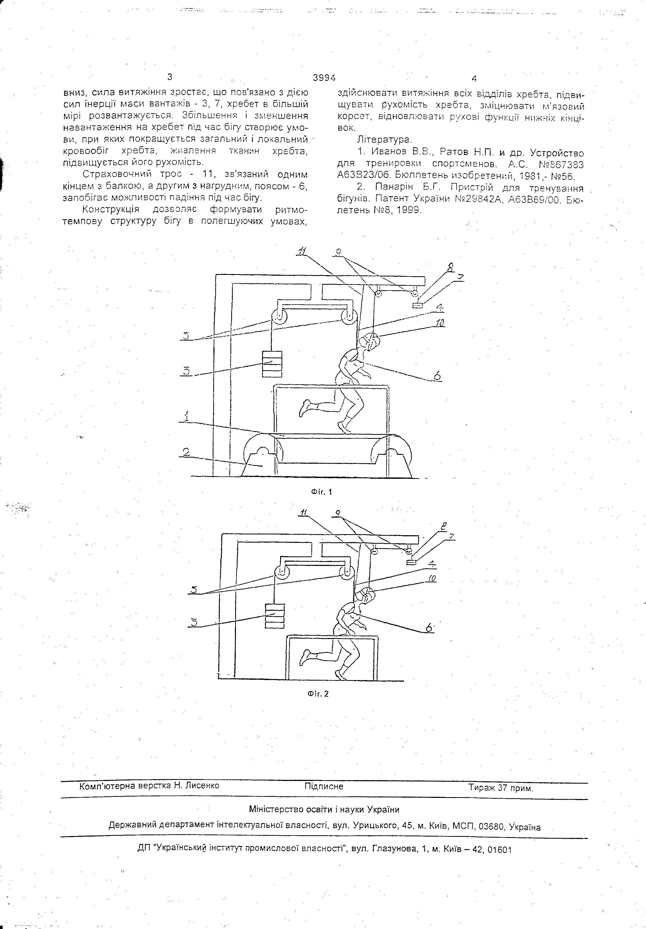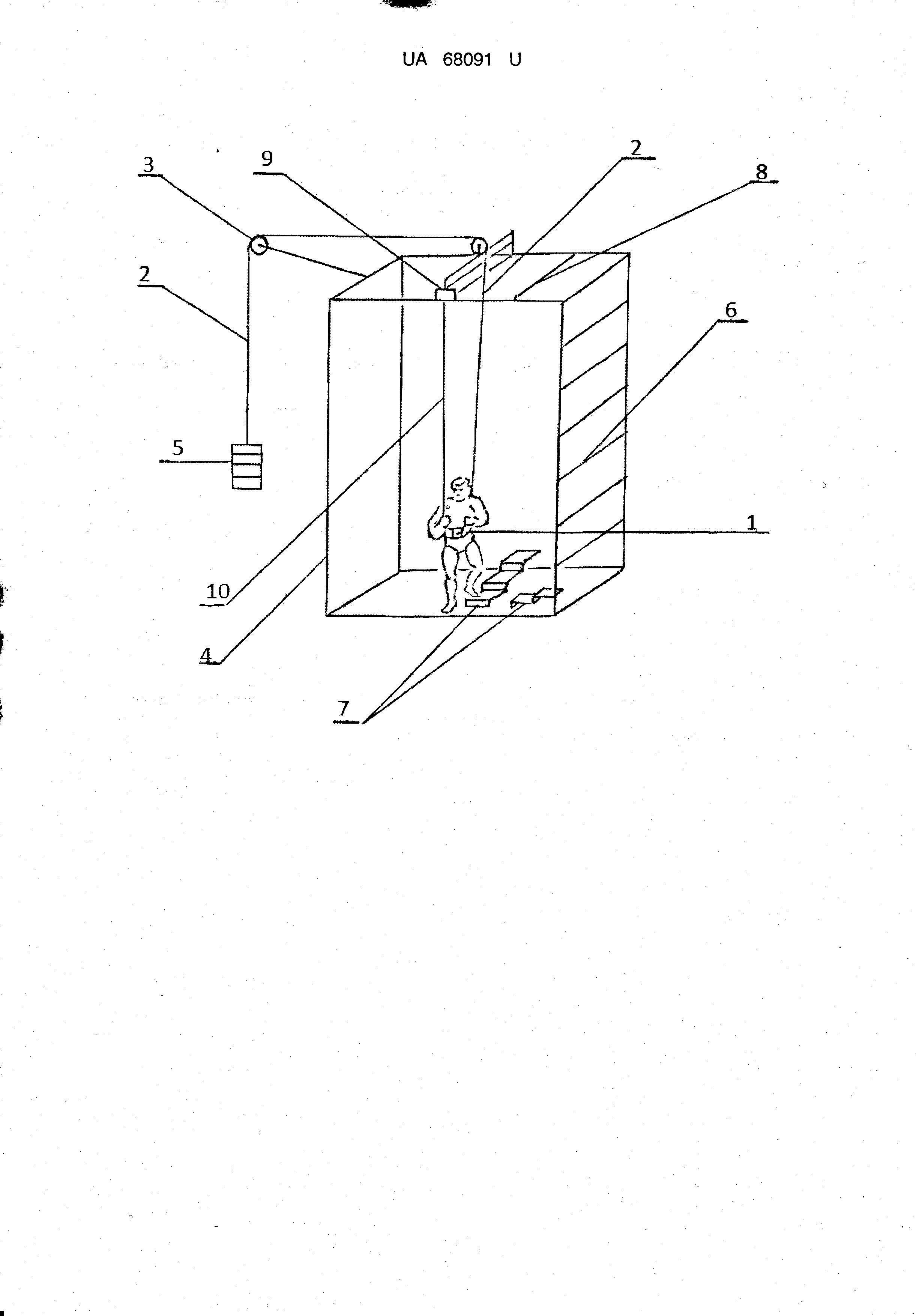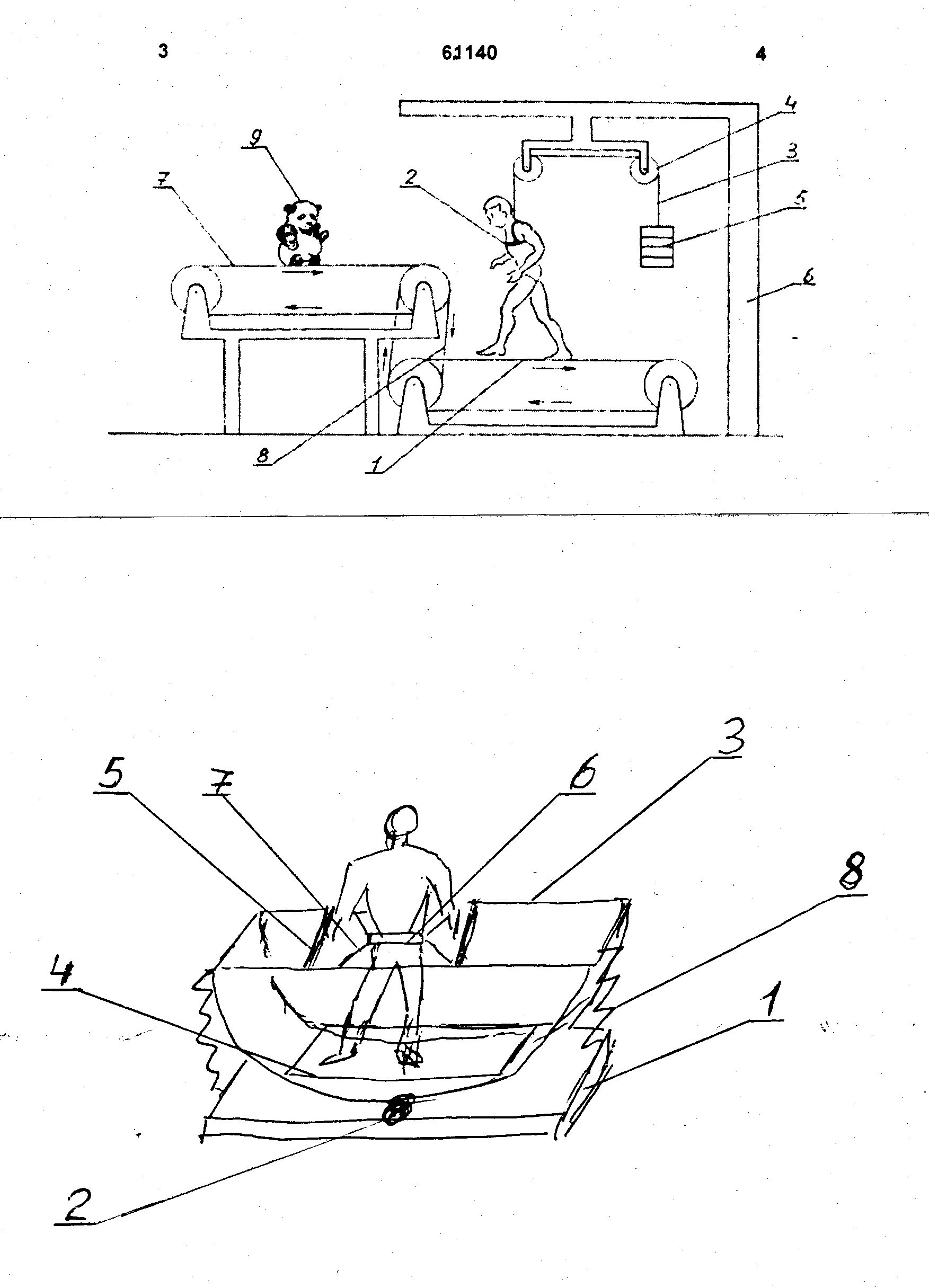 Пристрій містить: привідну безкінечну рухому стрічку - 1, змонтовану на рамі - 2, навантажувальний засіб - 3, котрий з'єднаний за допомогою троса - 4, блоків - 5 з нагрудним поясом - 6, навантажувальний засіб - 7, зв'язаний за допомогою троса - 8, блоків - 9 з петлею Гліссона - 10, що закріплена на голові користувача, страховочний трос - 11.